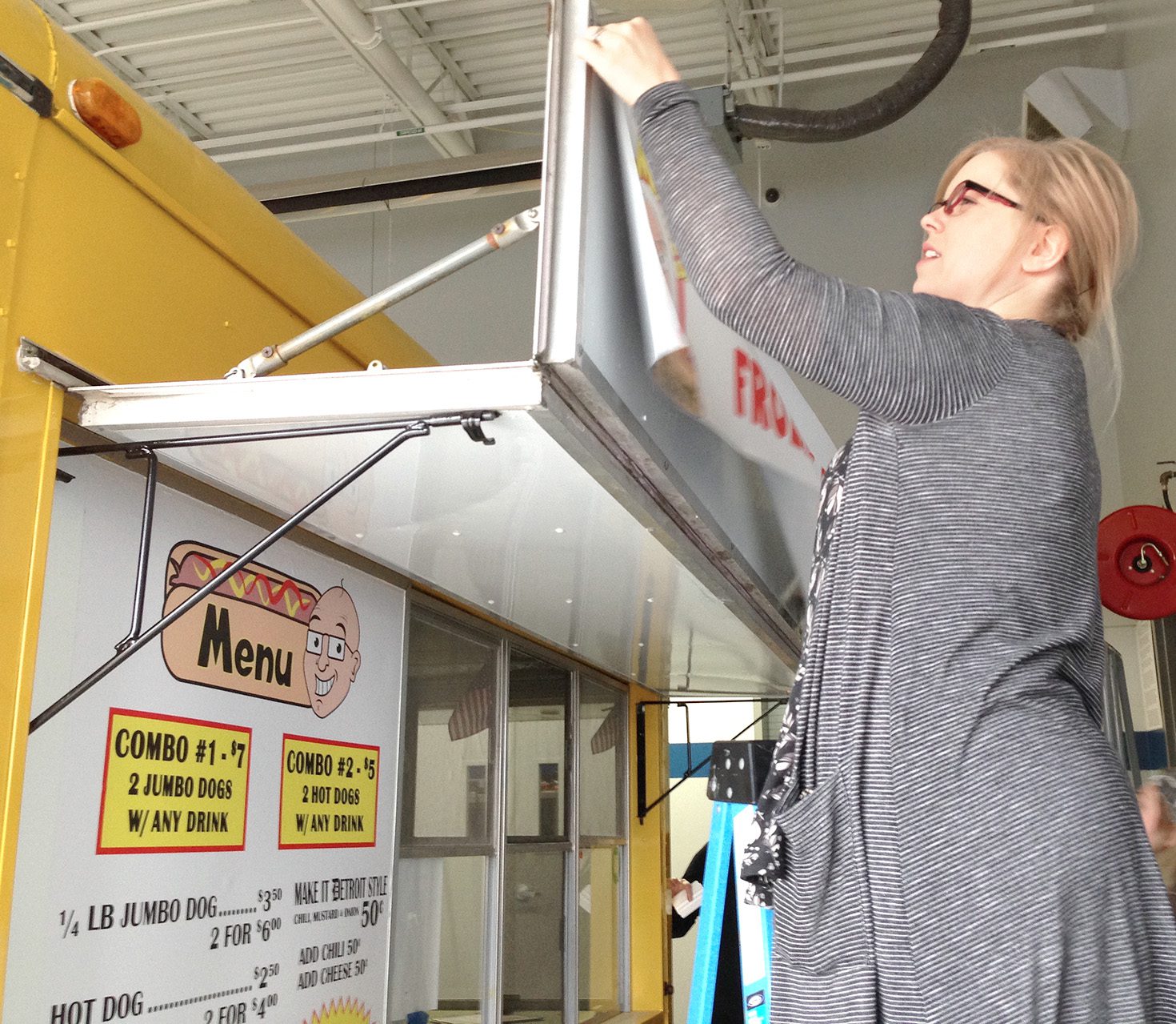 Baker College student Stephanie Brown applies one of the vinyl transfer signs to Mr. Marc’s Dog House concession trailer. Baker College of Auburn Hills President Peter Karsten said, “An opportunity like this builds confidence as well as student portfolios and shows what it’s like to accomplish something tangible in a student’s chosen trade – something that will benefit a charity for years to come.”