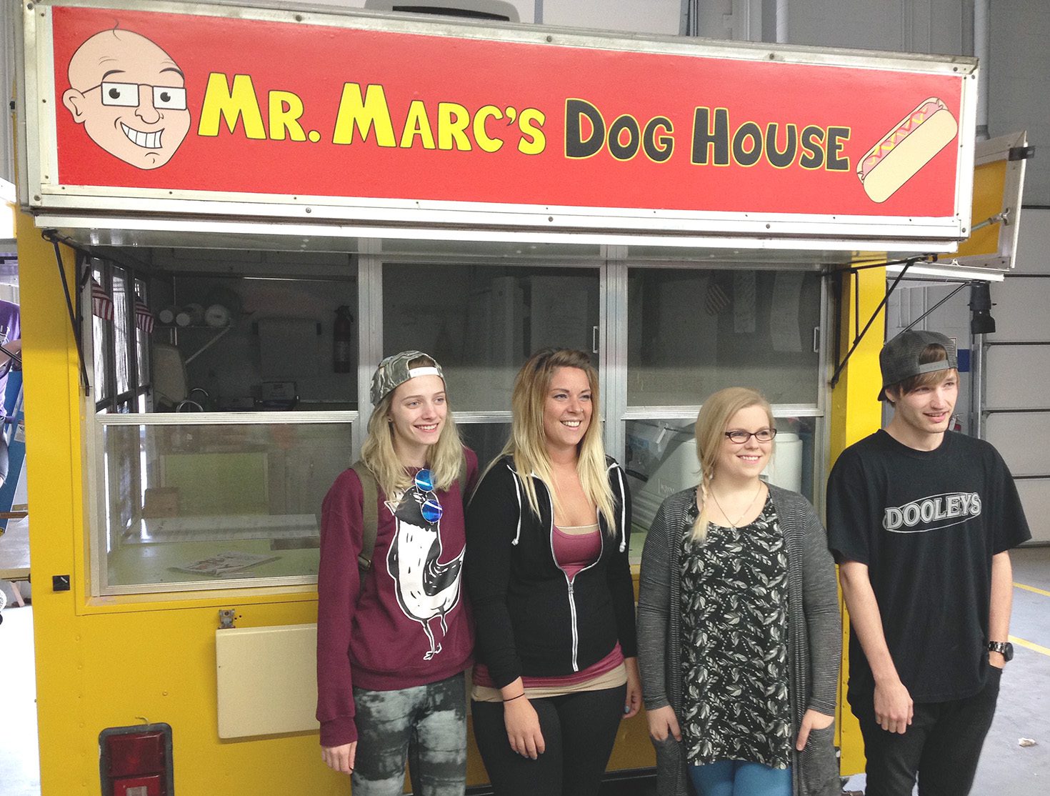 Baker College students Hannah Burns, Royal Oak; Emily Carpenter, Lapeer; Stephanie Brown, Oxford; and Colin Morey, Lake Orion, pause for a photo after completing the rebranding of Mr. Marc’s Dog House concession trailer.