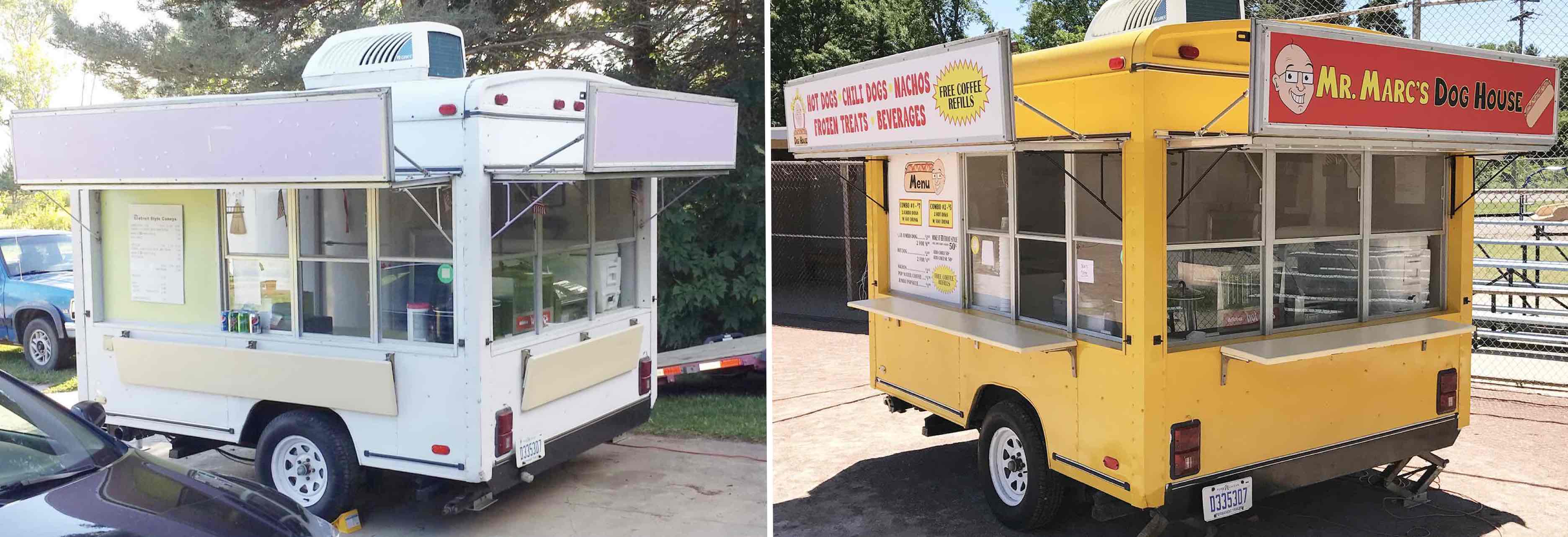 Shown is Mr. Marc’s Dog House concession trailer before and after the rebranding by Baker College students in the digital media design and autobody technician programs. “The students exceeded my expectations,” Marc Schillinger said. “It’s obvious the faculty provides quality training and creates an atmosphere of collaboration. We were able to debut the reimagined trailer this summer as planned at the Port Austin Farmer’s Market, marking it the ninth year we have participated.”