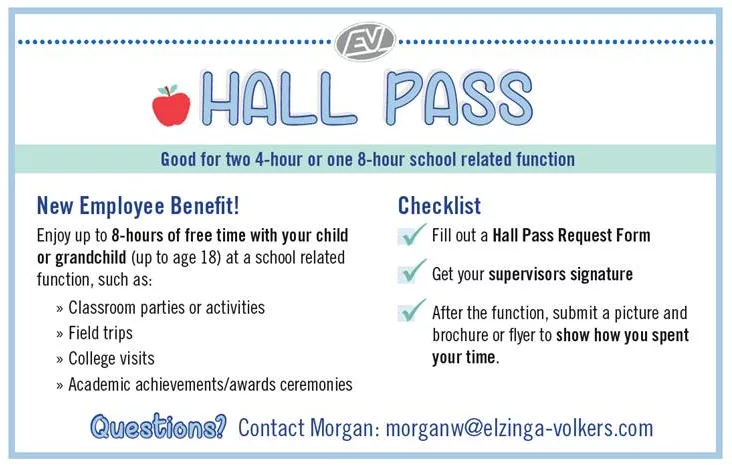 Elzinga & Volkers (E&V) not only cares for their employees, but also their families. Recently, E&V created the “Hall Pass” program – allowing employees to enjoy up to 8-hours of free time with their child or grandchild at a school related function.