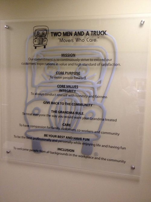 At the end of the interview, we’d have to say the best thing about going “Behind the Scenes” at Two Men and a Truck was finding out how the logo was created. We set up our camera right in front of the large drawing of two men inside a moving van, created by Sheets for her sons when they founded the company.