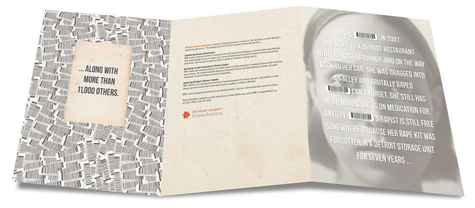 It was a shining moment for Davidson and the rest of the Enough SAID team. Using strong words and images, they were able to share how important the effort was to get these rape kits tests. The pamphlet incorporated the USB code that labels each rape kit as a design element to emphasize that each code represents the suffering of a real victim without justice.