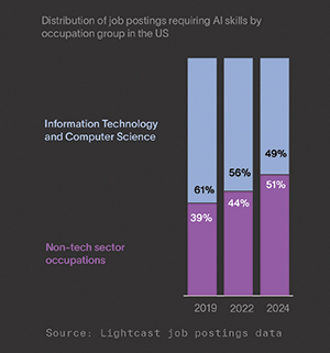 In 2019, 61% of postings requiring AI skills were in technical fields. That percentage has steadily declined since 2022, just before ChatGPT launched, with 49% of AI postings in technical fields and 51% in non-technical occupations for 2024.