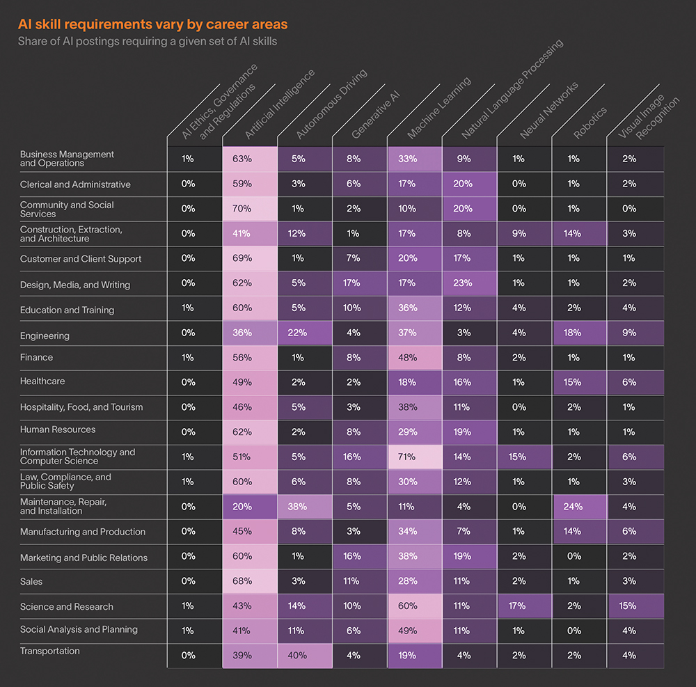 Each career area is in a different stage of AI adoption, but the careers also require different AI skills. For example, autonomous driving skills appeared in 40% of AI job postings for transportation positions, and robotics capabilities appeared in 24% of maintenance positions. Science and research roles demanded a wider range of AI skills, with machine learning in 60% of these postings, neural networks in 17% and visual image recognition in 15%. Generative AI were highest for postings in marketing and public relations, and in design, media and writing.
